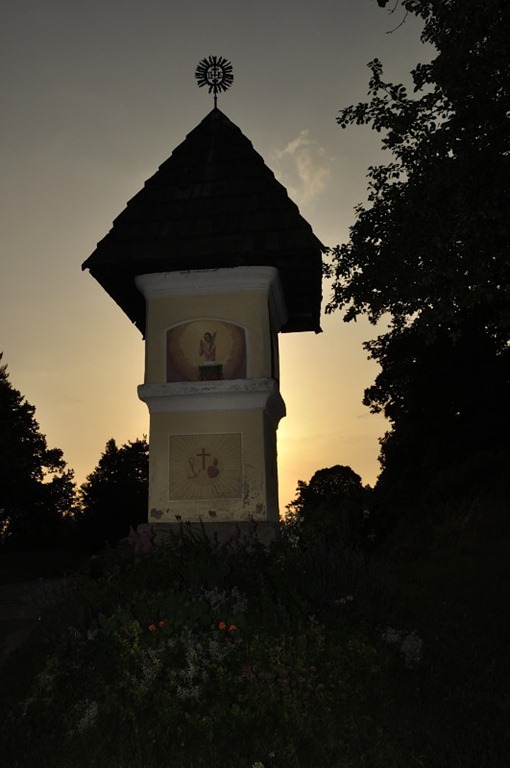 Es war “technisch” schwer zu fotografieren. Die hinter dem Marterl aufgehende Sonne führt ja ansonsten dazu dass das Marterl komplett schwarz wäre wie die Bäume rechts und links. Gegenlichtaufnahme eben. Abhilfe schafft da der Blitz. Allerdings muss genau probiert werden wie hell bzw wie stark dieser “blitzen” darf und aus welcher Entfernung und das bei ständig heller werdendem Sonnenaufgang, also Gegenlicht. Das ich keinen überteuerten Nikonblitz besitze und den leistbaren nur etwas von Hand einstellen kann erleichtert das nicht gerade….